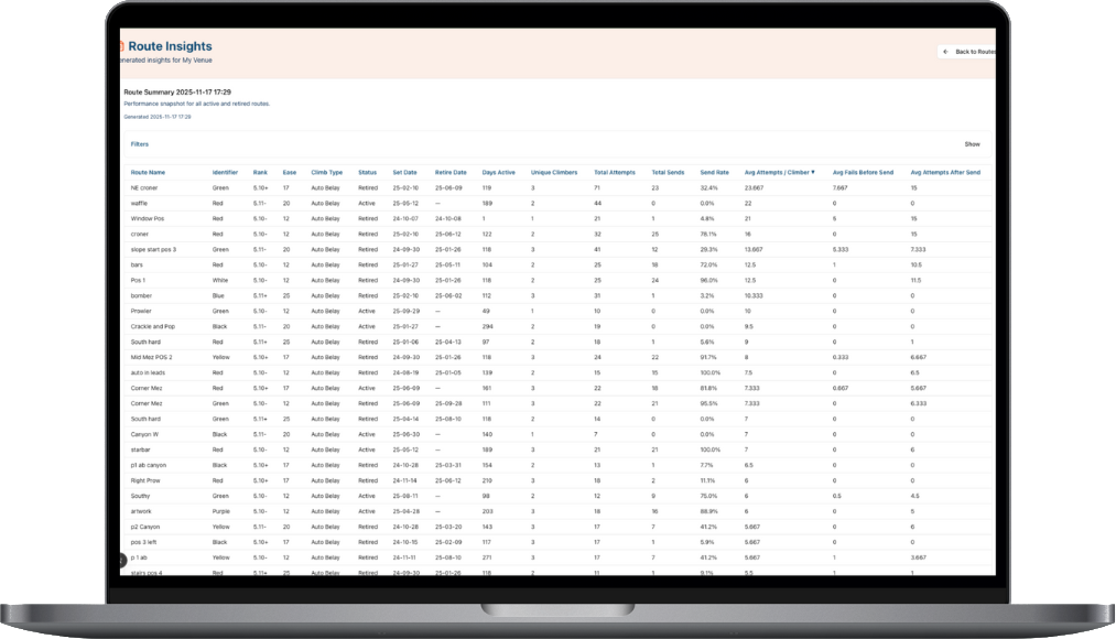 Unlock actionable route & climber insights — See route popularity, climber trends, and progress instantly.